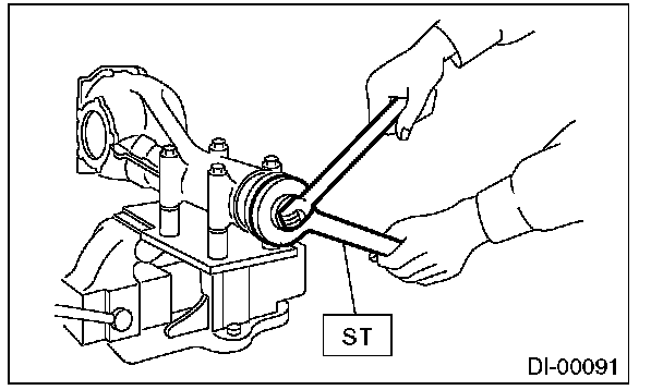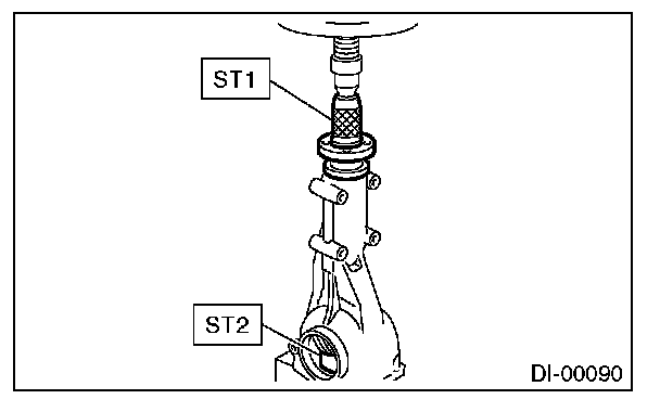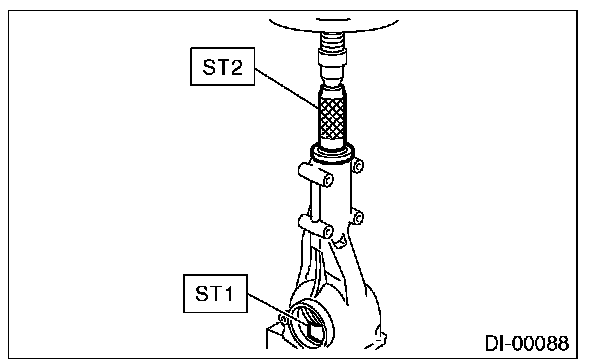 (2) Install the front bearing race to the differential carrier using ST1 and ST2.