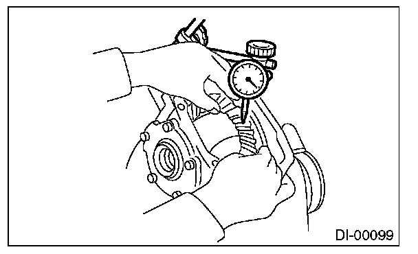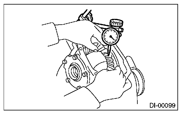 18) Check the runout on the back side of the hypoid driven gear, and make sure that the pinion and hypoid driven gears rotate smoothly. If the runout on the back side of the hypoid driven gear exceeds the specification, check for any foreign material between the hypoid driven gear and differential case, and for any deformation of the case or gear.