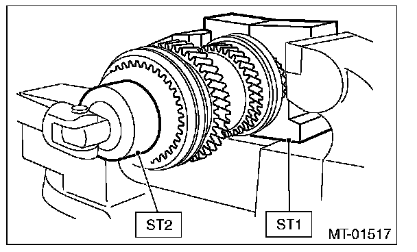 6) Using the ST1 and ST2, install the 5th gear thrust washer and 5th needle bearing race onto the rear section of transmission main shaft.