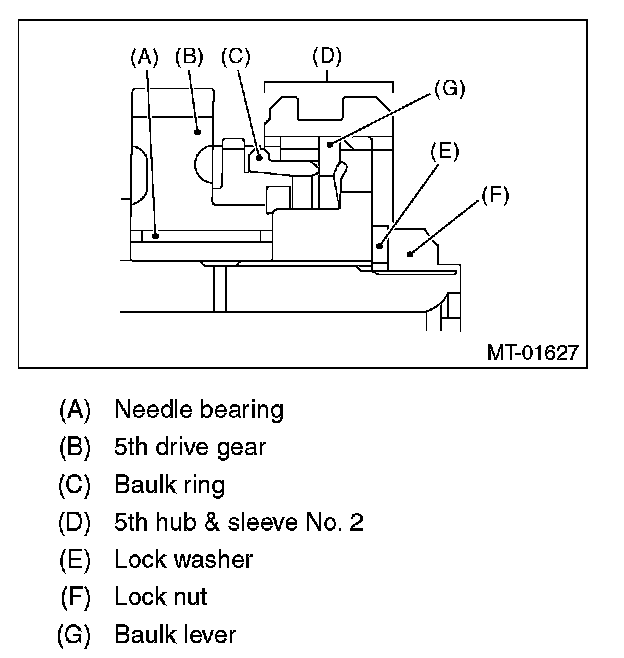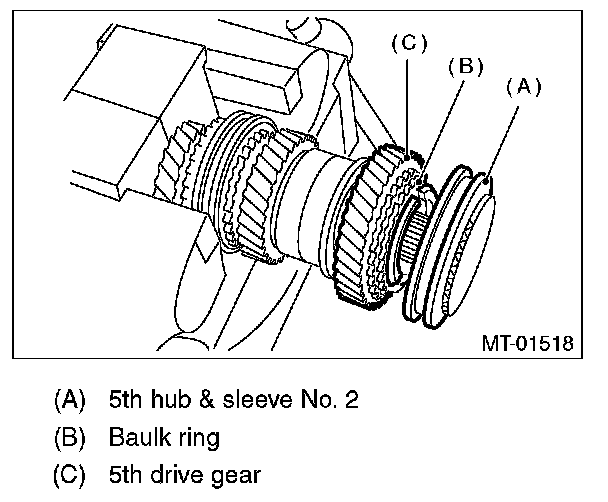 3) Remove the 5th hub & sleeve No. 2, baulk lever, baulk ring, and the 5th drive gear & needle bearing.