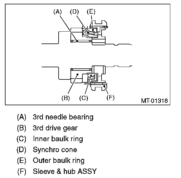 2) Install the 3rd drive gear, outer baulk ring, synchro cone, inner baulk ring, sleeve & hub assembly for the 3rd needle bearing, on the transmission main shaft.