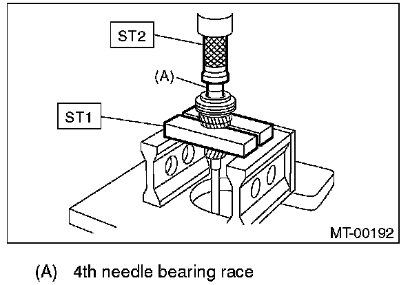 3) Install the 4th needle bearing race onto transmission main shaft using ST1, ST2 and press.