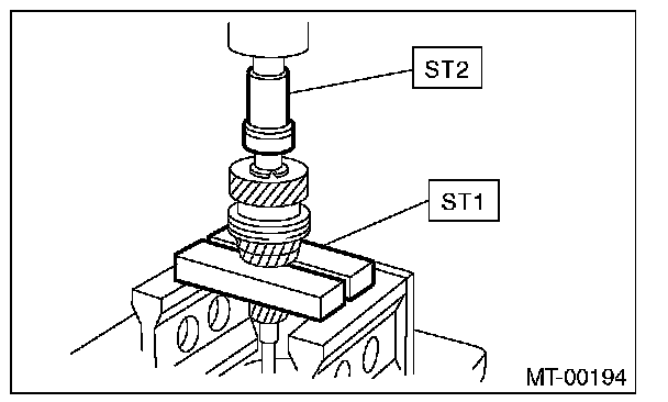 5) Press-fit the ball bearing into the rear section of transmission main shaft using ST1, ST2 and a press.