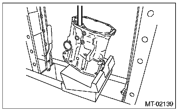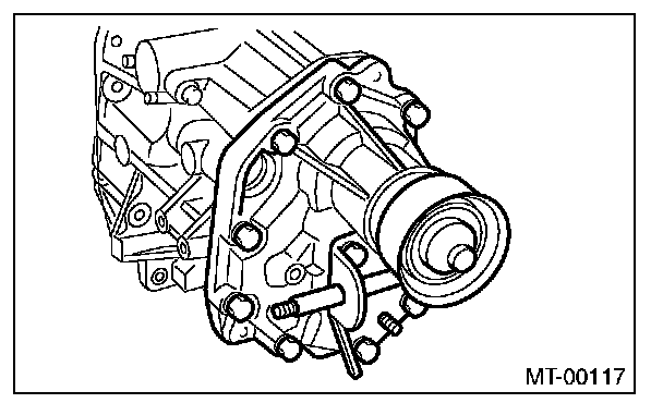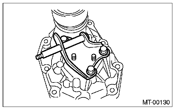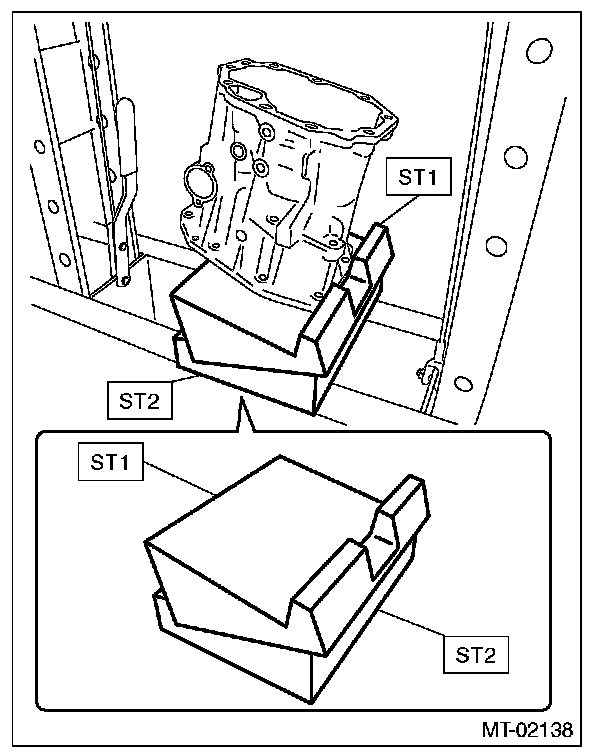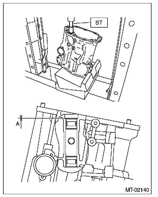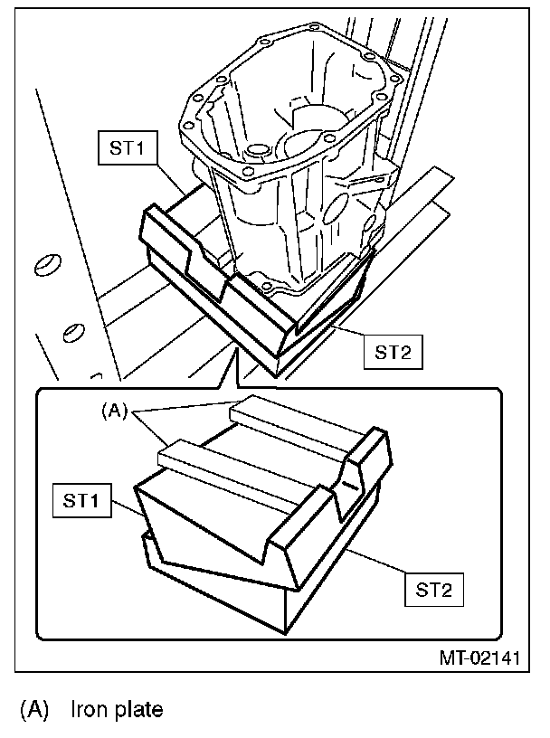 ^ Insert the iron plate which is thicker than the exposed length of the transfer case knock pin between the ST and transfer case.