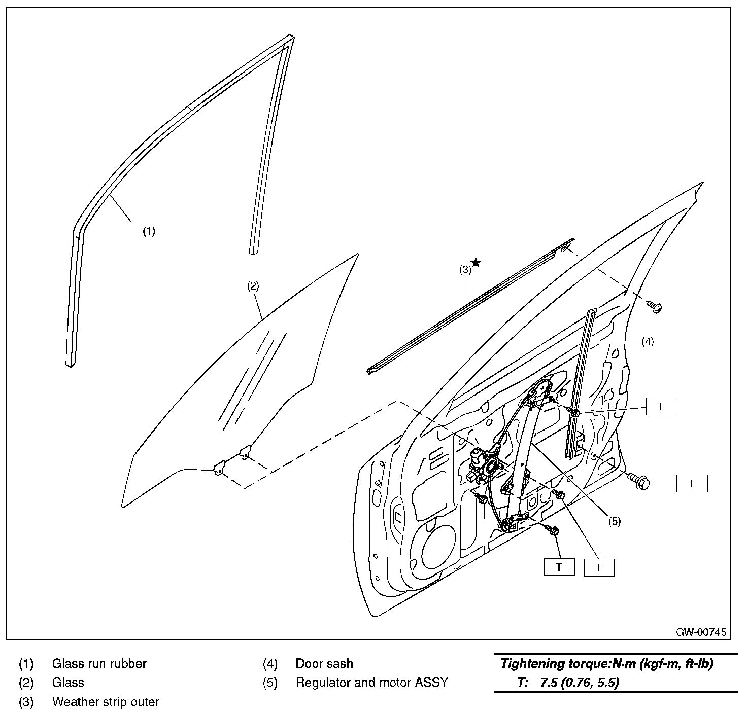 Tightening torque: Refer to "COMPONENT" of "General Description". [Ref. to, FRONT DOOR GLASS, COMPONENT, General Description.]