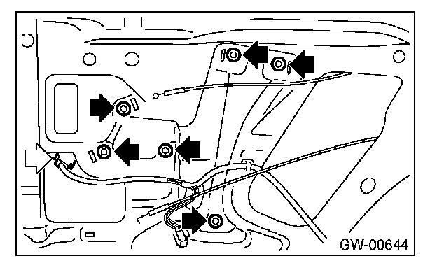 3 Remove the bolts, and then remove the rear regulator and regulator assembly.