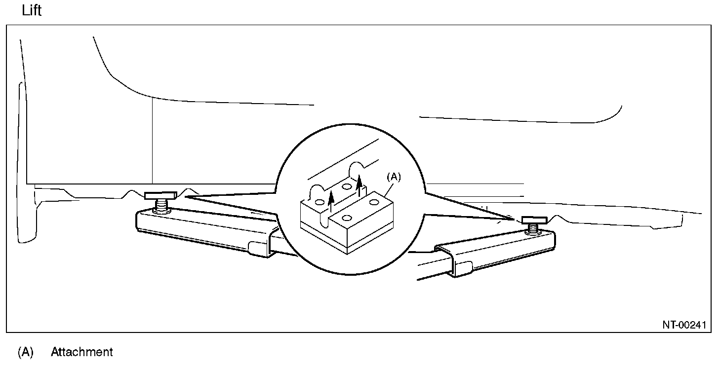 - For models with side sill spoiler, use a spacer or an attachment to lift up the vehicle securely at jack up point, without contact of side sill spoiler and lift.