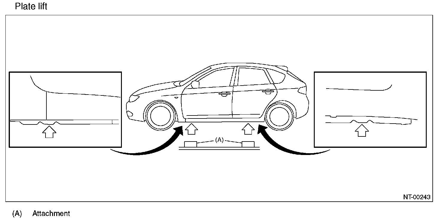 - Do not use the plate lift whose attachment does not reach the supporting locations. The figure of vehicle indicates the supporting locations, supporting procedures, etc. for 5 door model, and they are same for 4 door model.