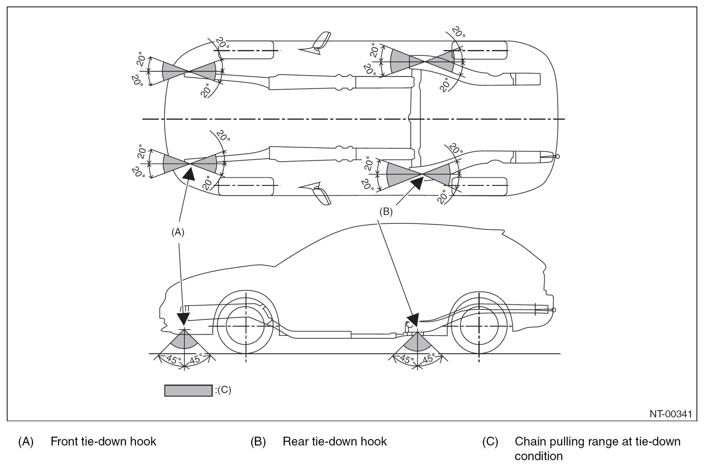 When the vehicle is tied down from vehicle inside, hook the hooks of tie-down chain from vehicle inside, and when the vehicle is tied down from vehicle outside, hook the hooks of tie-down chain from vehicle outside