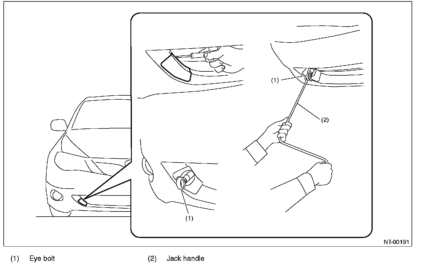 CAUTION: If jacking up the front side of the vehicle, make sure that the jack is attached at the center of the jackup plate not at the sides.
