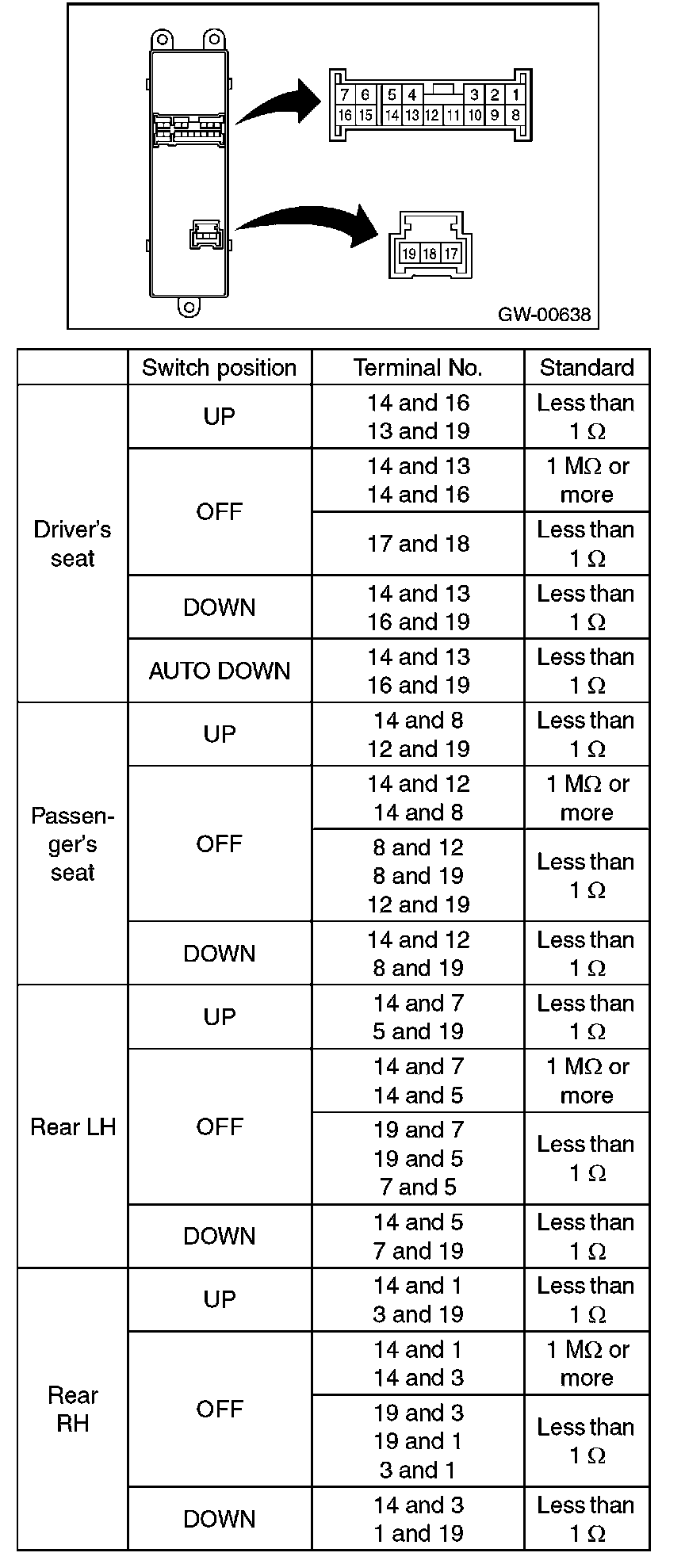 3. Replace the power window main switch if the inspection result is not within the standard value.