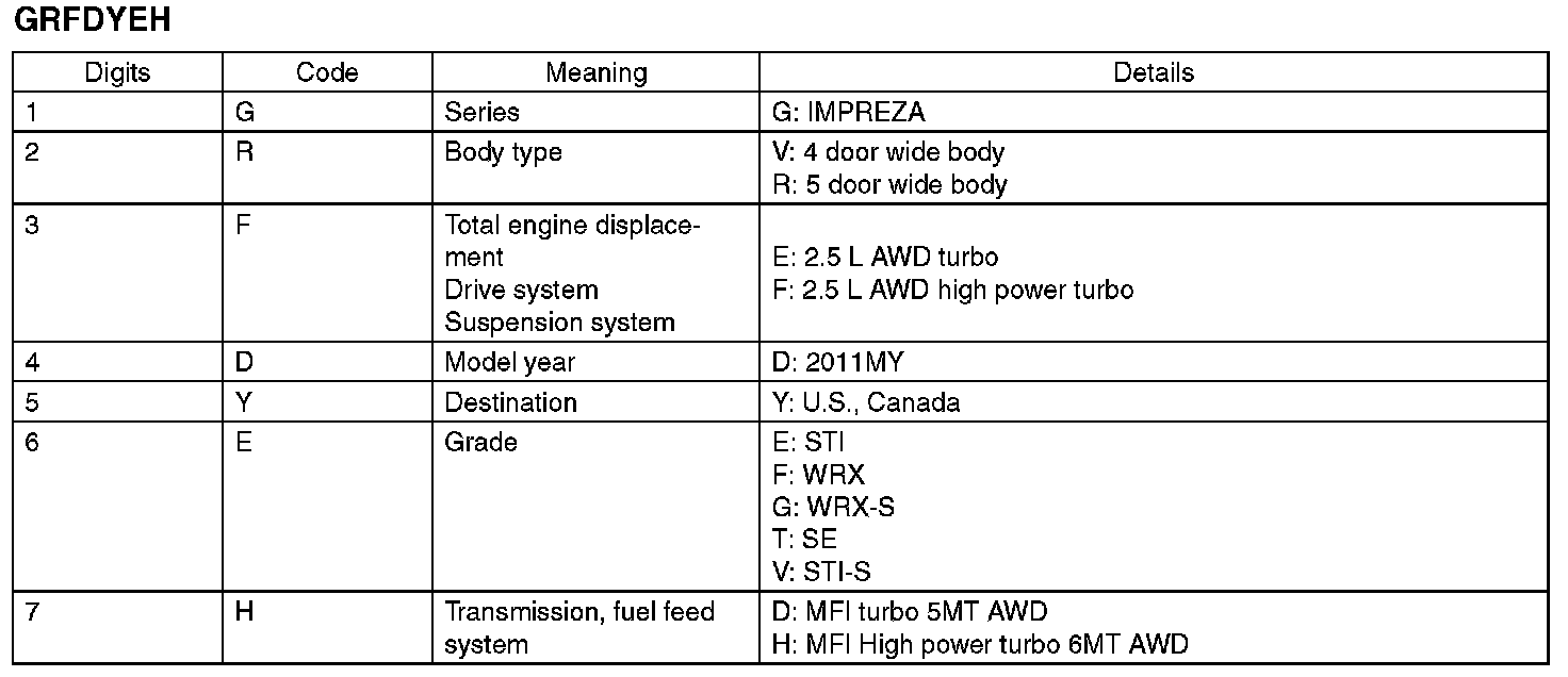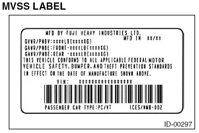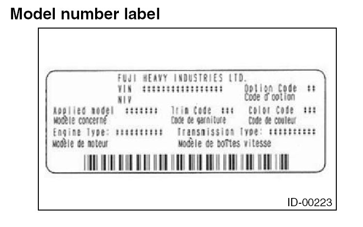 The model number label indicates: the applied model, the option code, the trim code, the engine type, the transmission type, and the exterior color code. This information is helpful when placing orders for parts.