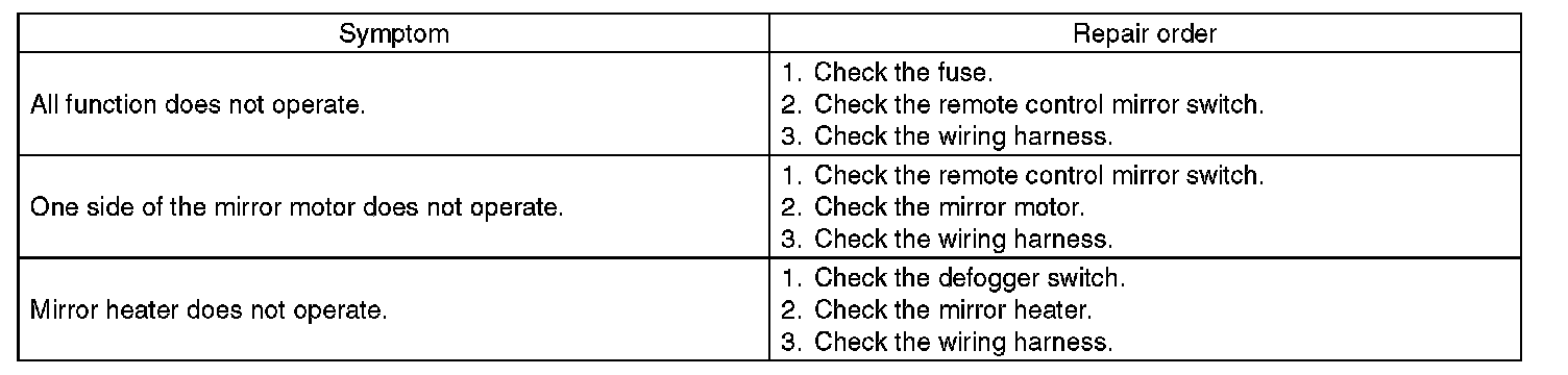 NOTE: The mirror heater operates with the rear window defogger at the same time. Refer to the inspection procedure of rear window defogger system for details. [Ref. to INSPECTION, Rear Window Defogger System.]