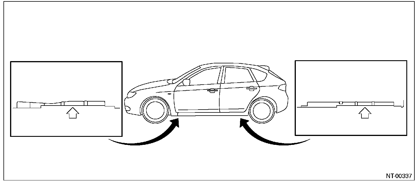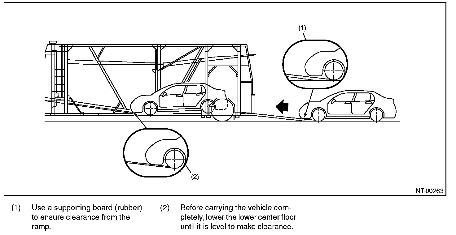 - When carrying the vehicle onto a car carrier truck, perform the operation being careful with the gap between the height of the carrier's floor and the vehicle lower side because of little clearance under the front bumper.