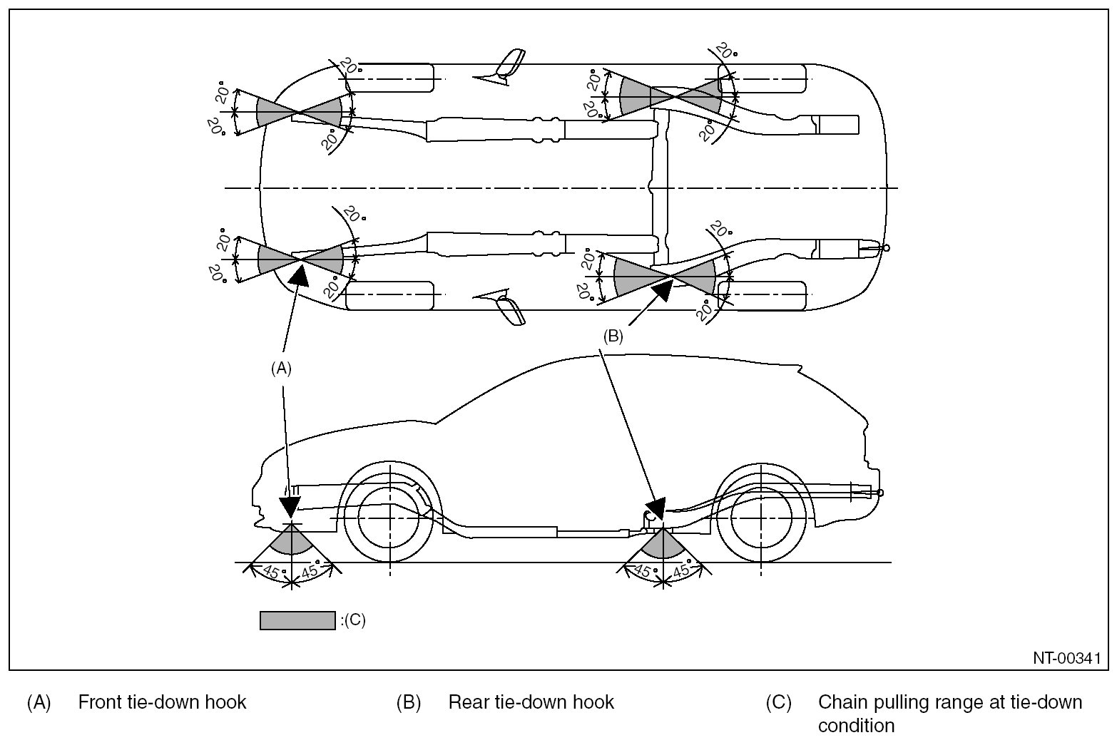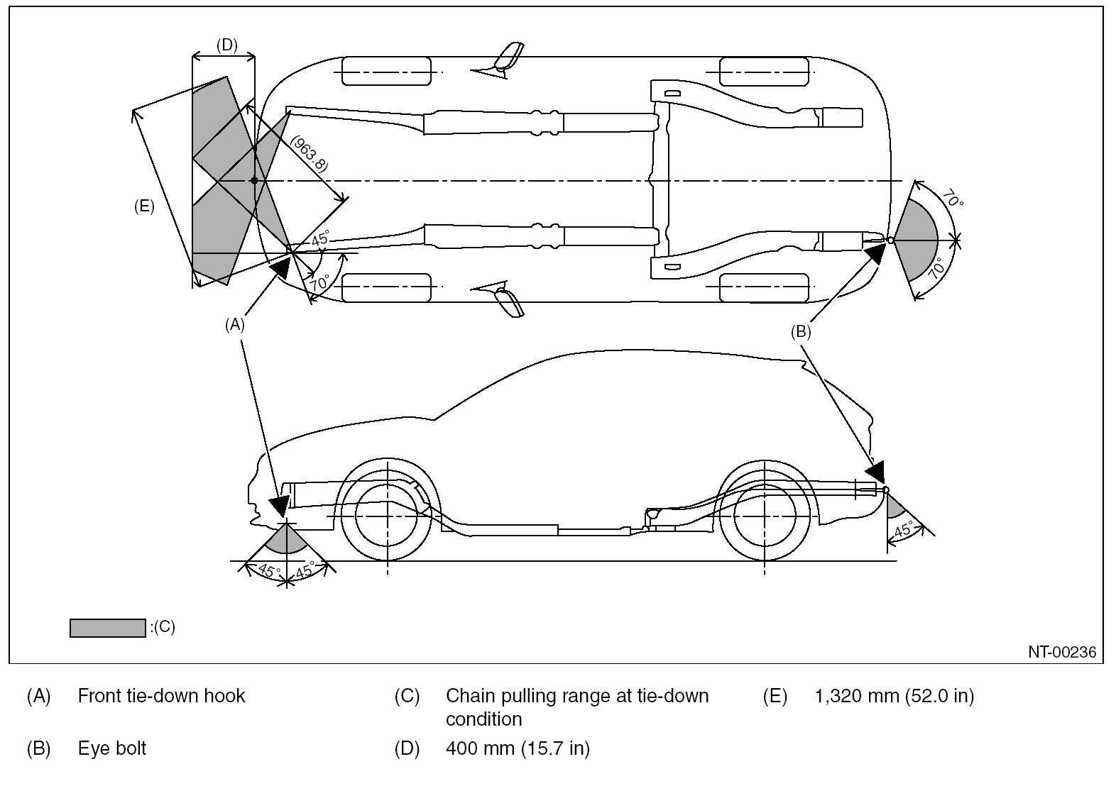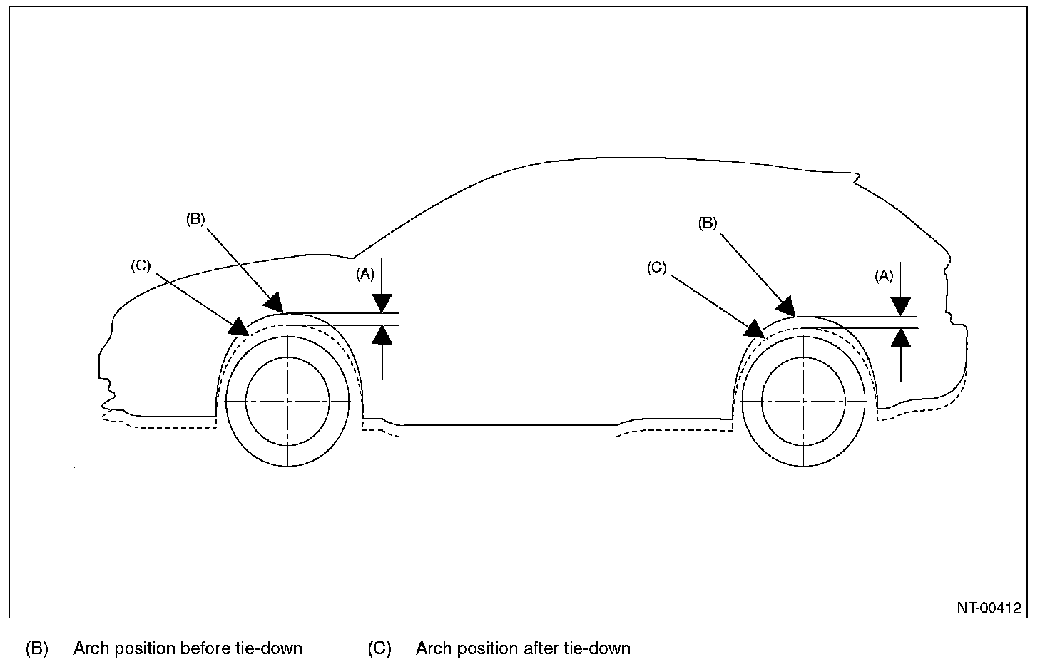 CAUTION: The vehicle sinking volume at tie-down condition should be less than 50 mm (1.97 in) and make sure to fix the vehicle securely.