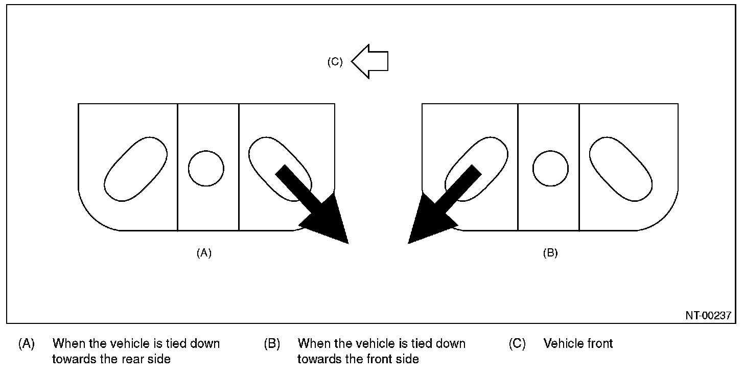 When the vehicle is tied down from the rear side, use the holes at the rear side, and when the vehicle is tied down from the front side, use the holes at the front side.