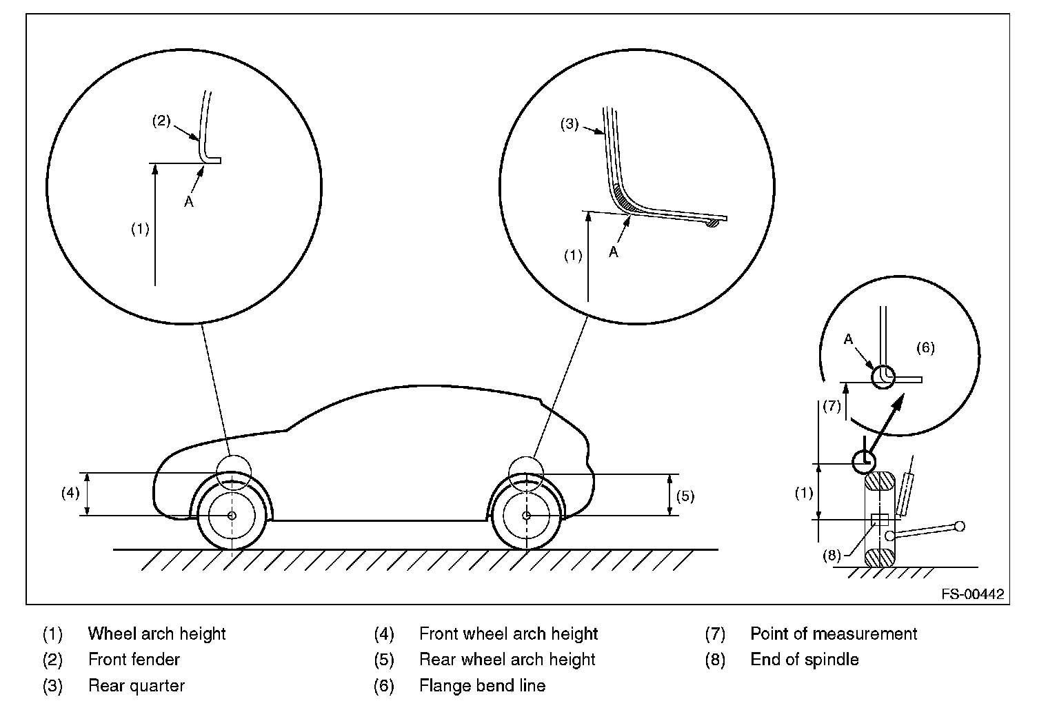 4) Suspend a thread from the wheel arch (point "A" in the figure (FS-00442)) and affix at a position directly above the center of wheel.