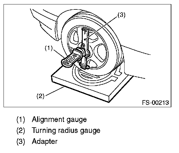 1) Place the front wheel on the turning radius gauge. Make sure the ground contact surfaces of the front and rear wheels are at the same height.