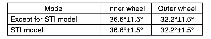 2) While depressing the brake pedal, turn the steering wheel fully to the left and right. With the steering wheel held at each fully turned position, measure both the inner and outer wheel steering angles.