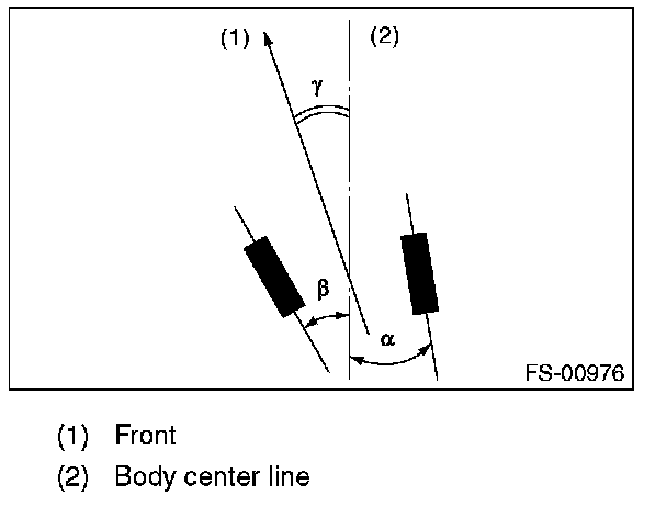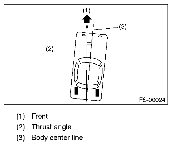 Thrust angle is a mean value of left and right wheel toe angles in relation to the vehicle body center line. Vehicle is driven straight in the thrust angle direction while slanting in the oblique direction depending on the degree of the mean thrust angle.