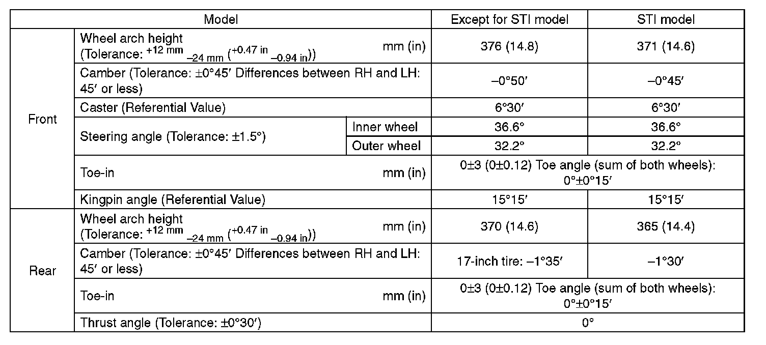 - Other items indicated in the specifications is not equipped with adjustment mechanisms. If other items exceed specifications, check the suspension parts and connections for deformation. If defective, replace with new parts.