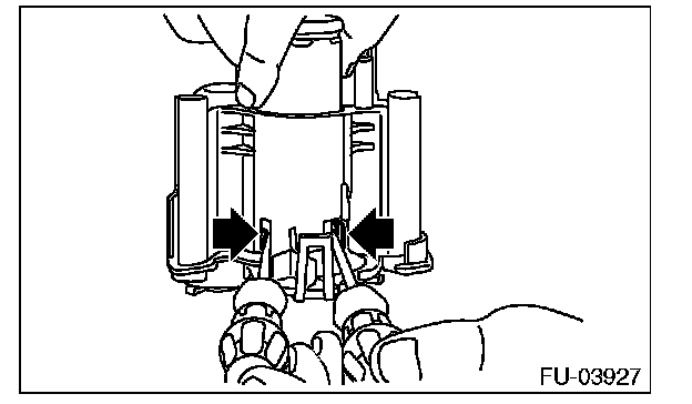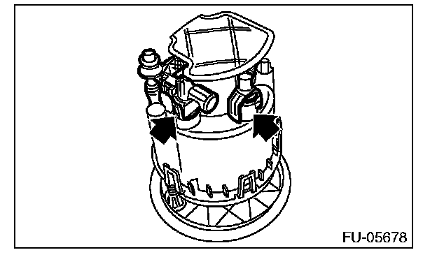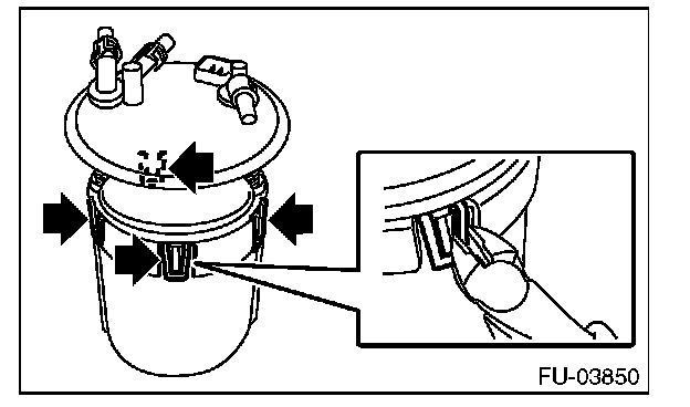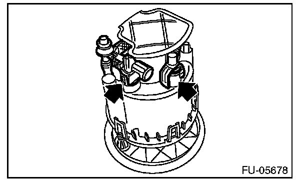 8. Lift the two tab holders connecting the pump assembly to the fuel filter using a flat tip screwdriver (with a shaft diameter of approx. 3 mm (0.12 in)), etc., and separate the fuel filter and pump assembly.