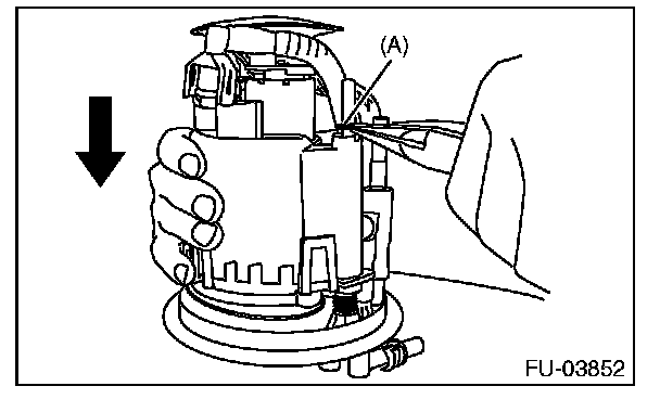 6. Push to compress the fuel filter assembly in the direction of the arrow, remove clip (A), and separate the sub tank bracket assembly and the fuel filter assembly.