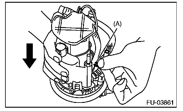 4. Push the fuel filter assembly in the direction of the arrow to compress, and attach clip (A).
