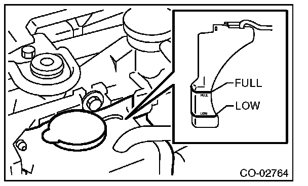 11) Open the coolant filler tank cap. If the engine coolant level drops, add engine coolant into the coolant filler tank up to the filler neck position and the reservoir tank to "FULL" level.