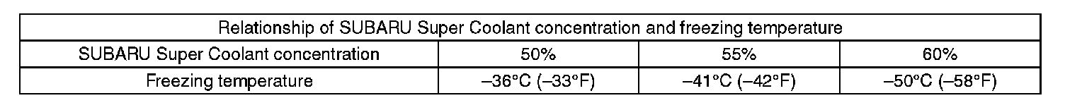 Use the SUBARU Super Coolant with a 50 - 60% concentration in order to obtain maximum antifreeze and anti-rust performance.