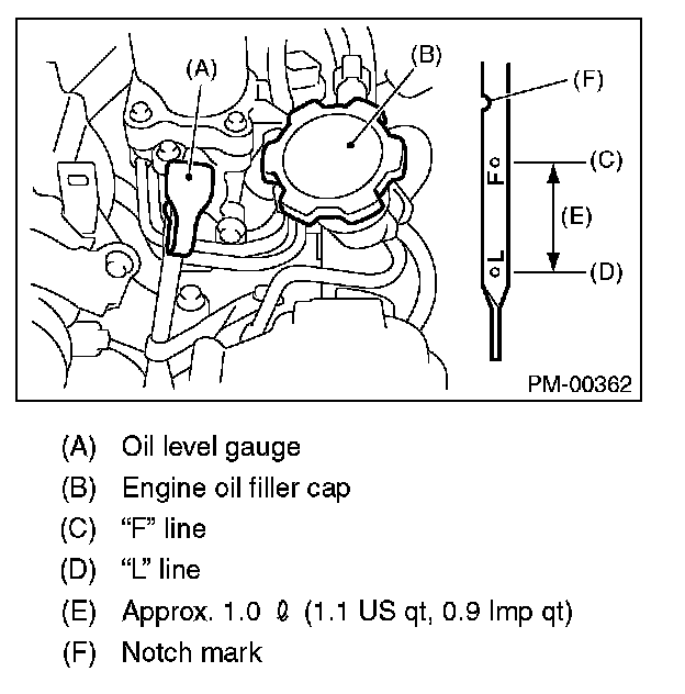 9) After stopping the engine, recheck the oil level. If necessary, add engine oil up to the "F" line on oil level gauge.