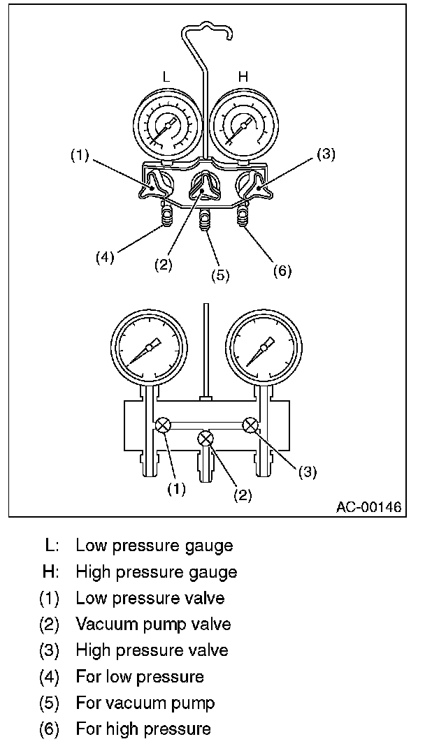 6. Leave alone for 5 to 10 minutes after closing the low pressure side and high pressure side valves, and check whether there is any change in the low pressure gauge needle indication. If the needle position changes, this indicates a leak. Check the pipe and hose connections, and repair the location with the problem. In this case, repeat again from step 1).