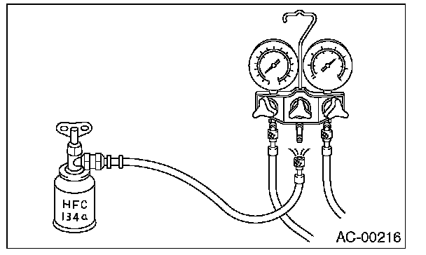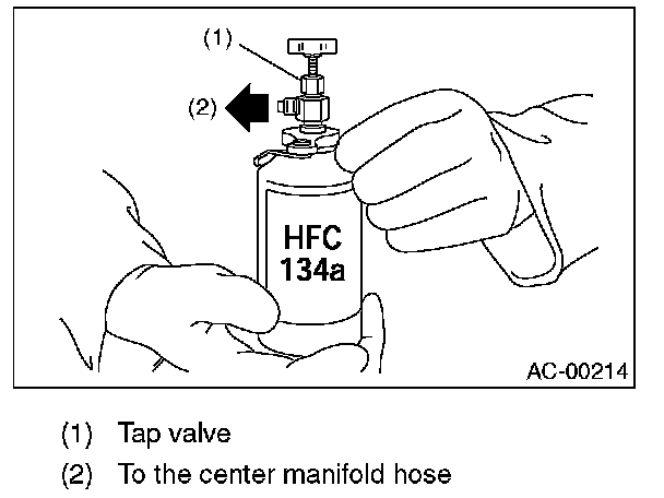 18. If the HFC-134a supply container becomes empty, close all valves, and close the can tap valve to replace the empty container. After replacing with a new HFC-134a supply container, perform air purge, and resume the filling operation.