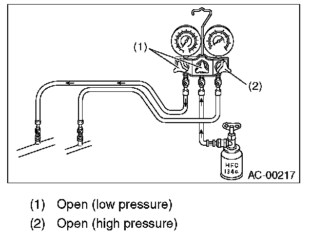 CAUTION: When filling with the engine running, do not open the high pressure side valve.