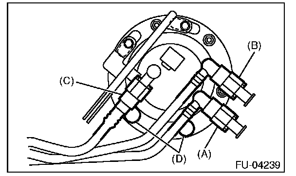 7. Disconnect the quick connectors of fuel delivery tube (A), fuel return tube (B), and jet pump tube (C).