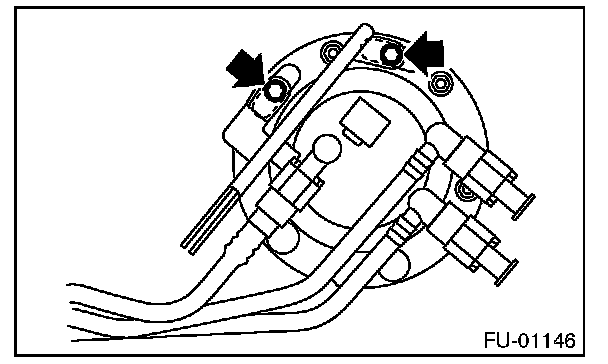 9. Remove the bolts and nuts which hold fuel sub level sensor protector and fuel sub level sensor upper plate to the fuel tank.