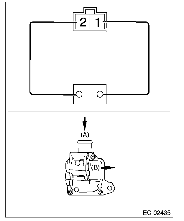 4. Connect the battery positive terminal to the terminal No. 2 and the battery ground terminal to the terminal No. 1. Check that air is discharged from (B), when supplying air to (A).