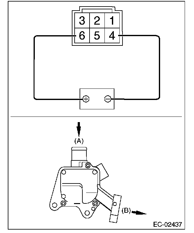 4. Connect the battery positive terminal to the terminal No. 6 and the battery negative terminal to the terminal No. 4. Check that air is discharged from (B), when supplying air to (A).