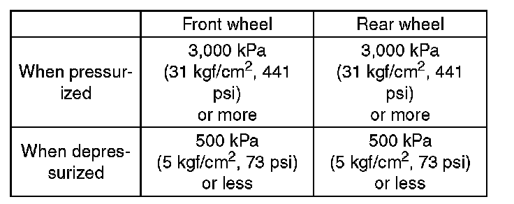 15) Read the values indicated on the pressure gauges and check if it is within specification. Depress the brake pedal and check that it is not abnormally hard, and tightness is normal.