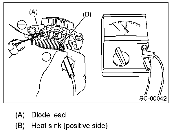 1. Check for continuity between the diode lead and positive side heat sink. If resistance is 1 ohm or more only in the direction from the diode lead to the heat sink, replace the rectifier.