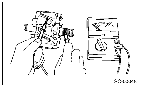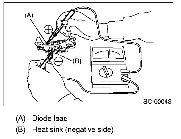 2. Check for continuity between the negative side heat sink and diode lead. If resistance is 1 ohm or more only in the direction from the heat sink to the diode lead, replace the rectifier.