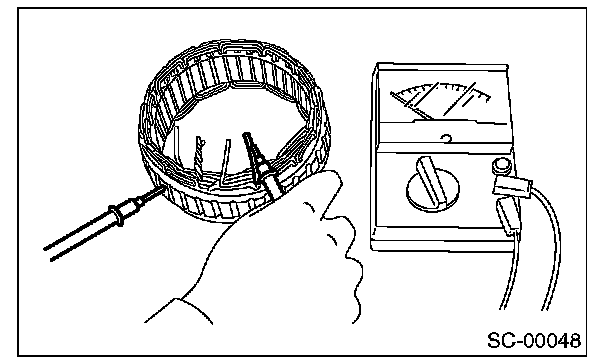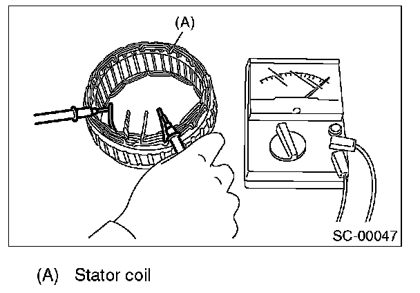 2. Inspect the continuity between the stator coil stator core and lead wire terminals. If the resistance is 1 ohm or less, replace the stator coil.