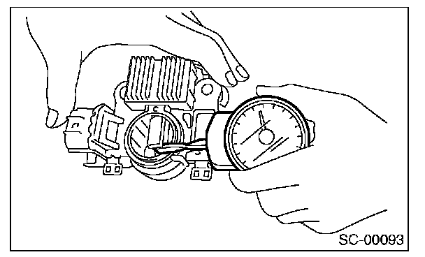 2. Using a spring pressure indicator, push the brush into the brush holder until its tip protrudes 2 mm (0.08 in). Then measure the pressure of brush spring. If the pressure is 2.648 N (270 g, 9.52 oz) or less, replace the brush spring with a new part. 4.609 - 5.786 N (470 - 590 g, 16.58 - 20.810 oz) pressure is required on the new spring.