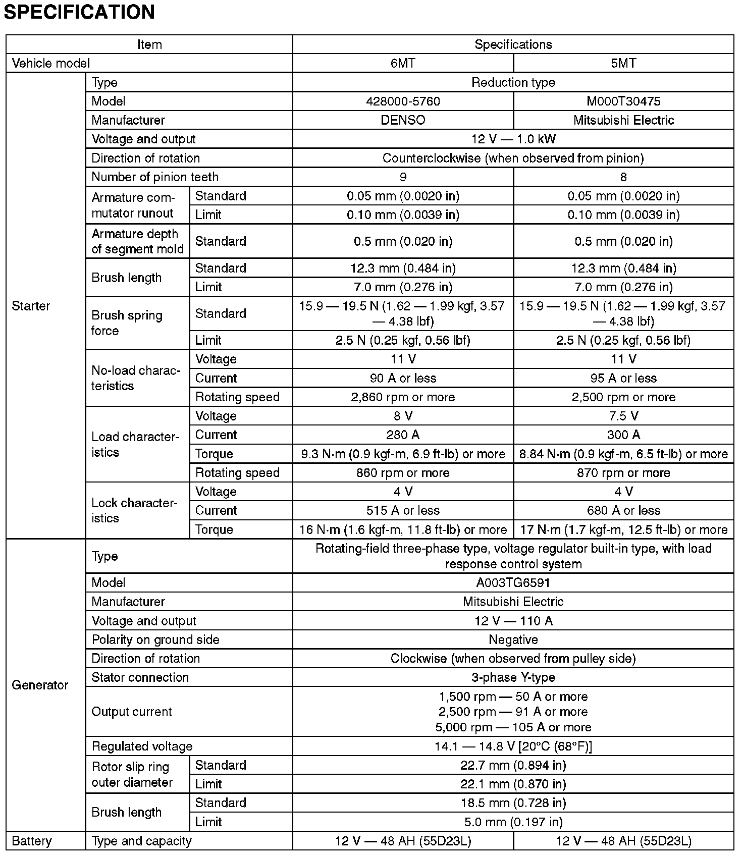 Starting and Charging: Specifications