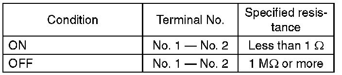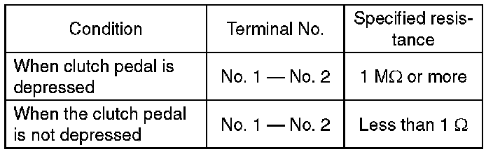 (2) Measure the resistance between terminal 1 and 2 of the switch. If the resistance is not within the specification, check the clutch stroke and installation condition, and check the clutch switch again.