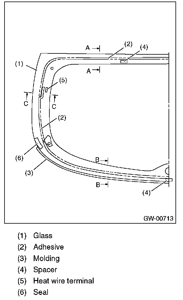 4. Apply adhesive in the same procedure as for windshield glass.