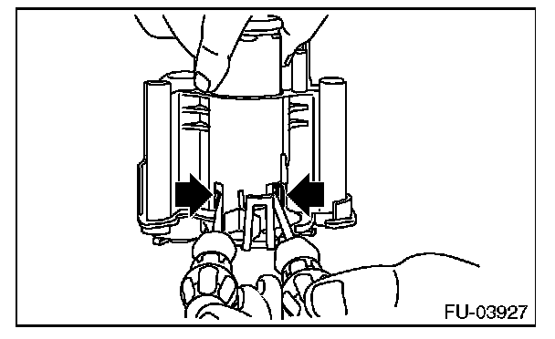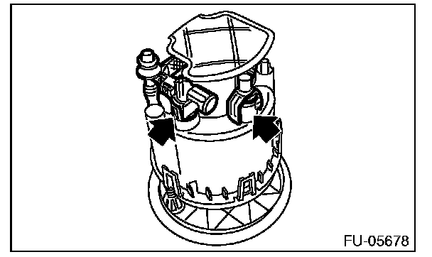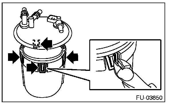 8. Lift the two tab holders connecting the pump assembly to the fuel filter using a flat tip screwdriver (with a shaft diameter of approx. 3 mm (0.12 in)), etc., and separate the fuel filter and pump assembly.