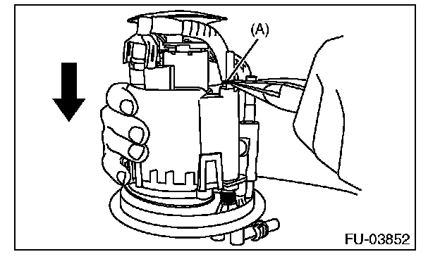 6. Push to compress the fuel filter assembly in the direction of the arrow, remove clip (A), and separate the sub tank bracket assembly and the fuel filter assembly.