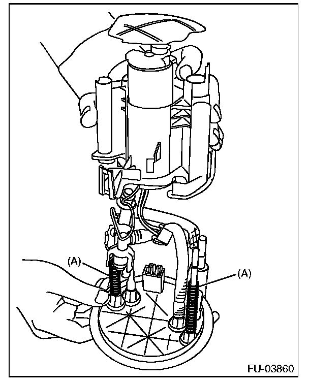 3. Attach spring (A) to the metal rod of the sub tank bracket assembly, and assemble the fuel filter assembly.
