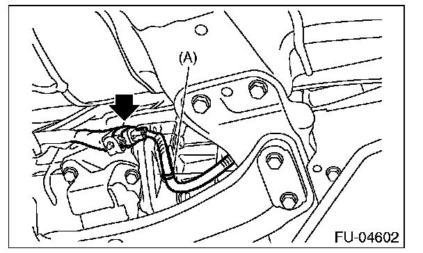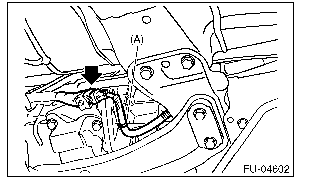 4. Disconnect the connector from the rear oxygen sensor, and remove the clip (A) holding the rear oxygen sensor harness.